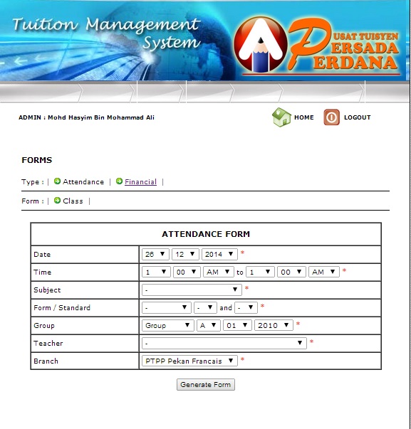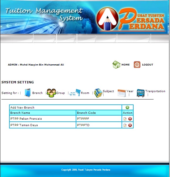 To setting the branch, group, room, subject, year and transportation.